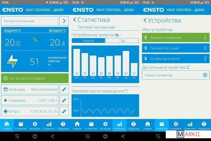 Оснащен Bluetooth модулем. Управление со смартфона через приложение Ensto Heat Control для Android/iOS позволяет создавать различные сценарии поддержания температуры. Приложение дает возможность оперативно контролировать ваши расходы и оперативно получать данные о расходе электроэнергии в реальном времени, недельном и годовом потреблении электроэнергии и график изменения температуры. Все это дает возможность существенно экономить электроэнергию. Конвектора можно объединить в группу до 10 шт. и управлять ими как одной системой.