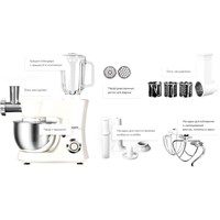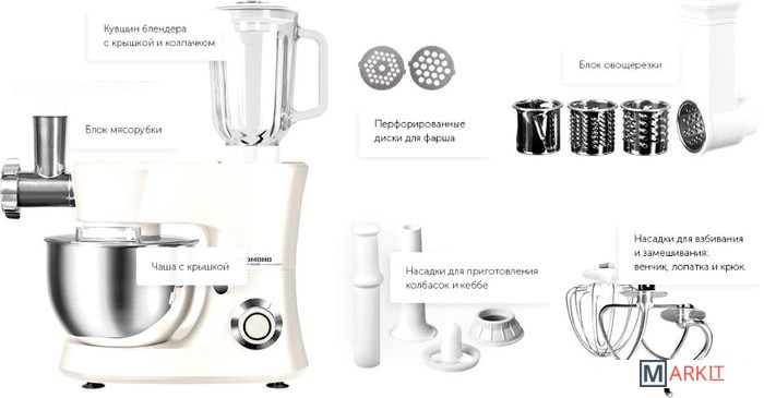 Функции мясорубка, блендер, взбивание, смешивание, замешивание дрожжевого теста, терка, шинковка, ломтерезка